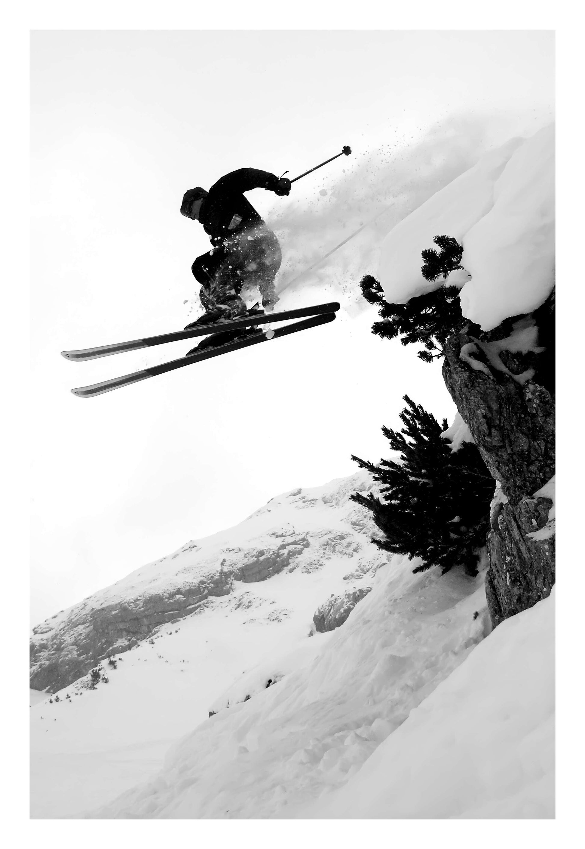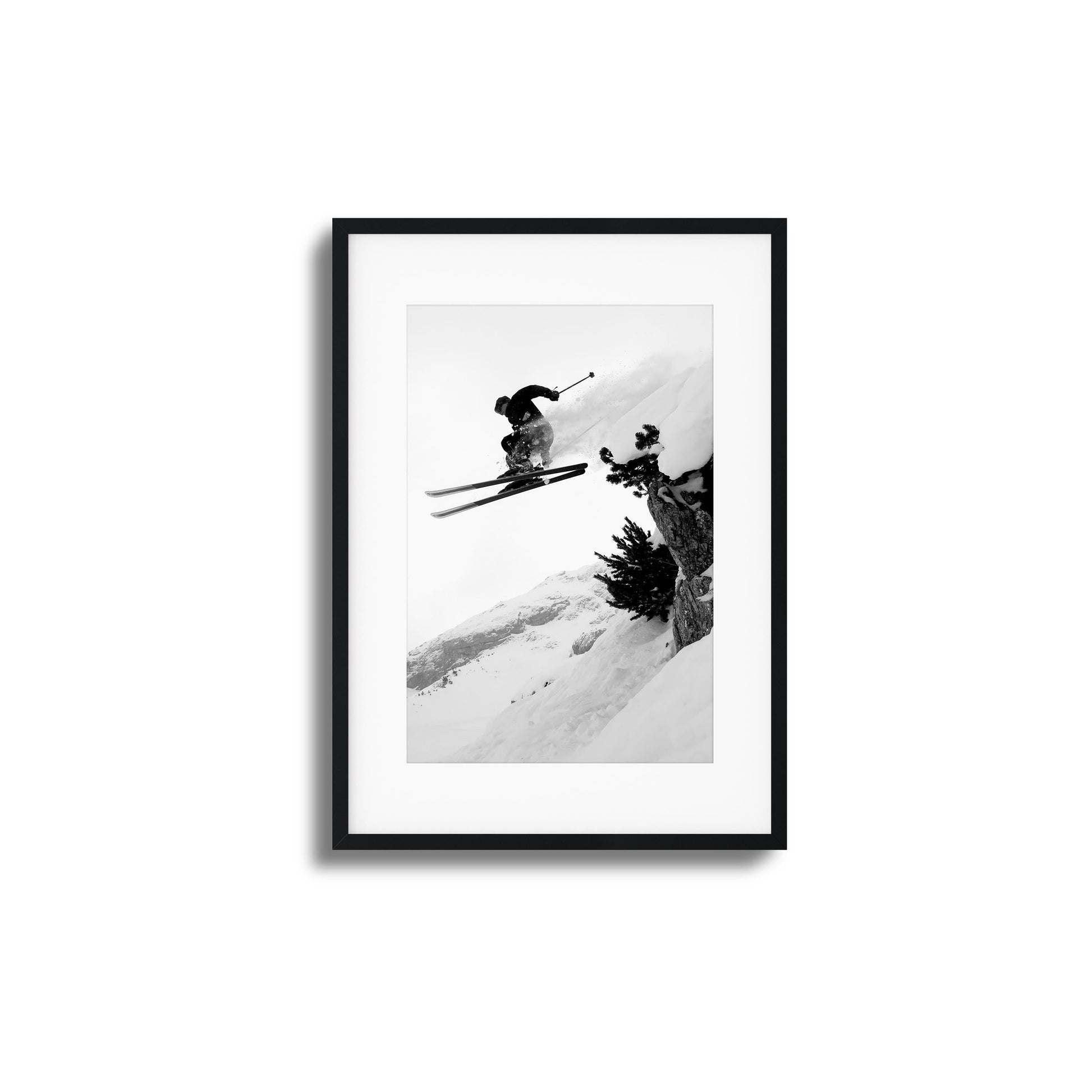 A bold black-and-white framed print capturing the thrill of a skier mid-jump on a snowy mountain, perfect for adding adventure and energy to your space.