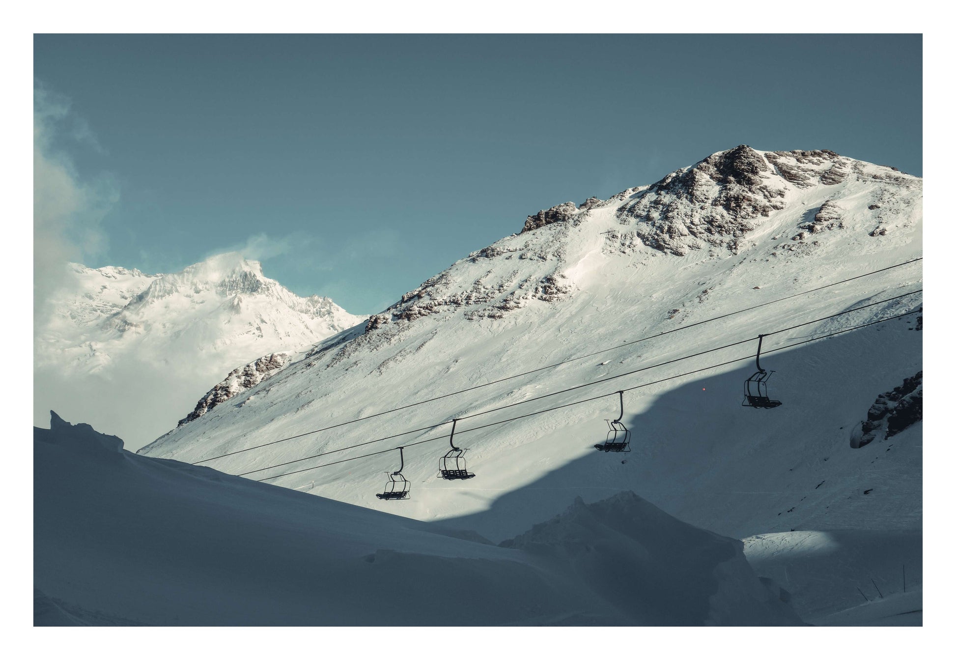 Snowy mountain ascent with empty lifts brings stillness to framed photography. Iconic framed art and prints for wall with serene winter charm.