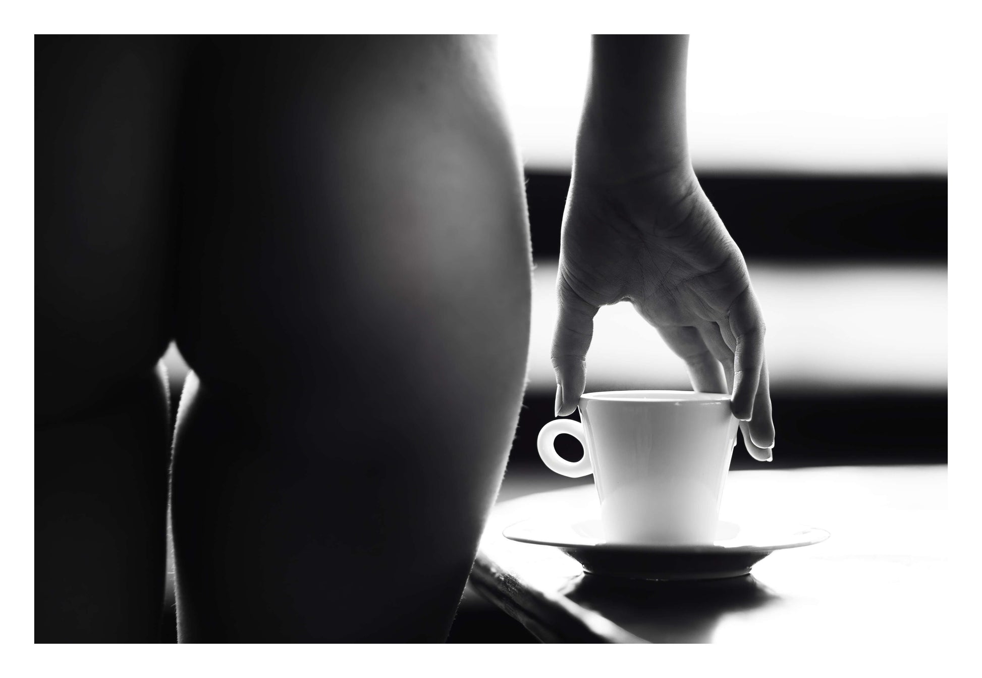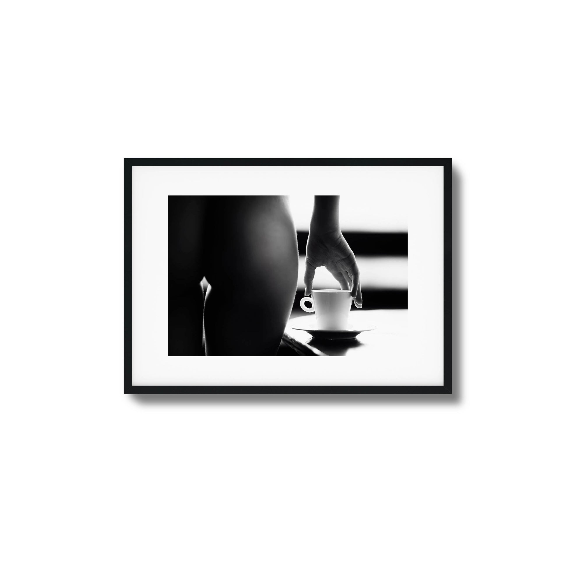 A sophisticated black-and-white framed print combining sensuality and the quiet elegance of a morning coffee ritual, perfect for contemporary spaces.