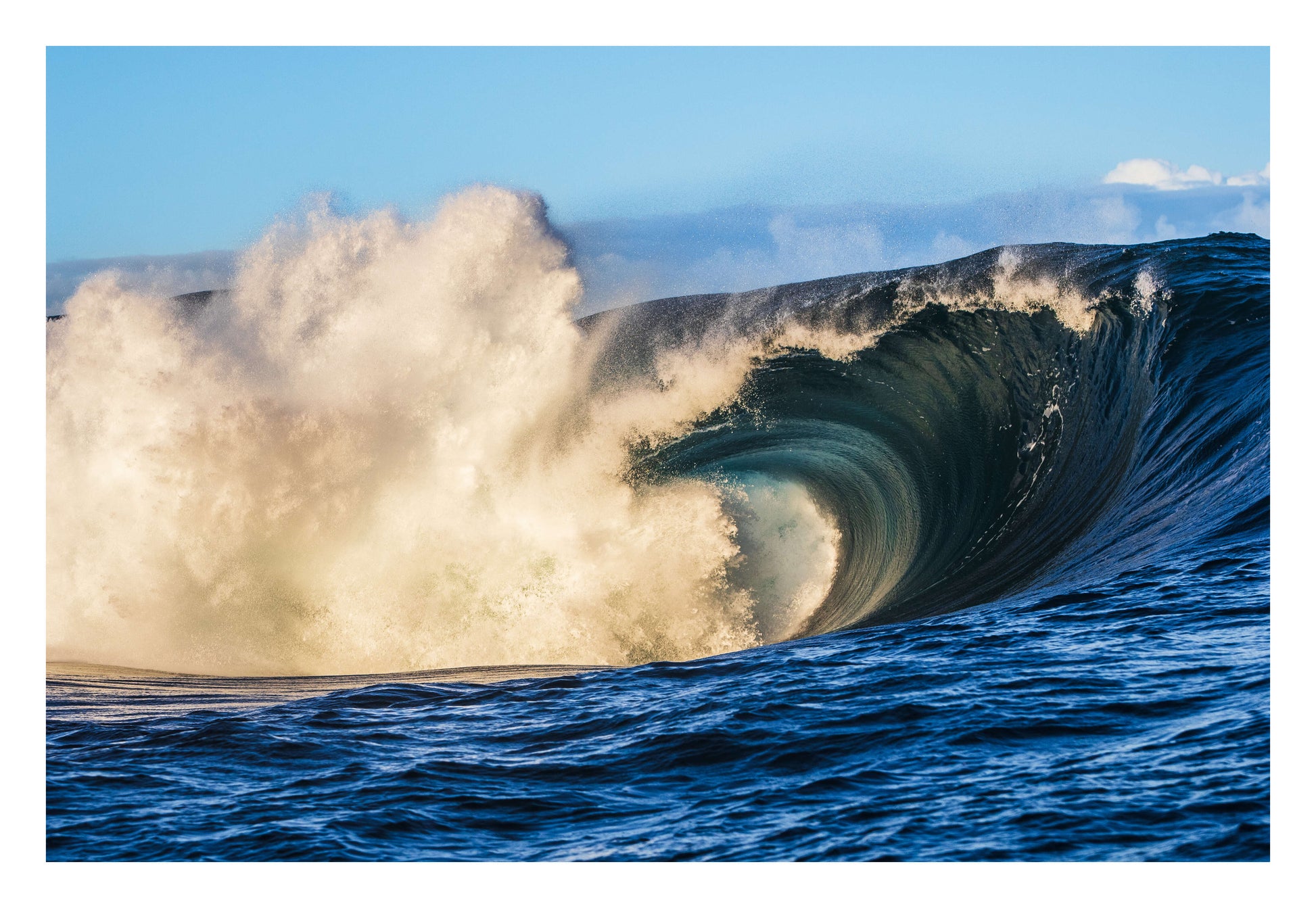 A dramatic wave exploding into a cloud of mist, frozen in time in this powerful ocean photography print.