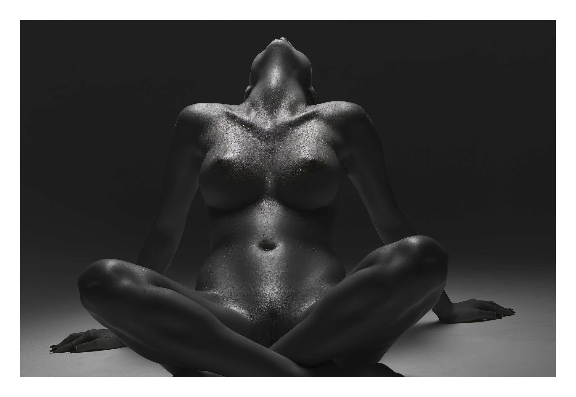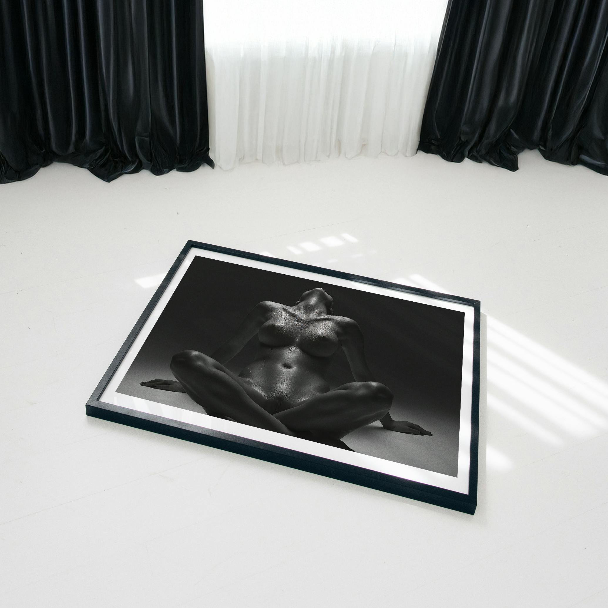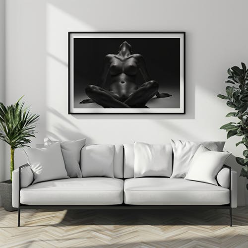Eclipse framed art captures the beauty of the human form in a striking, minimalist black and white composition, highlighting graceful curves.