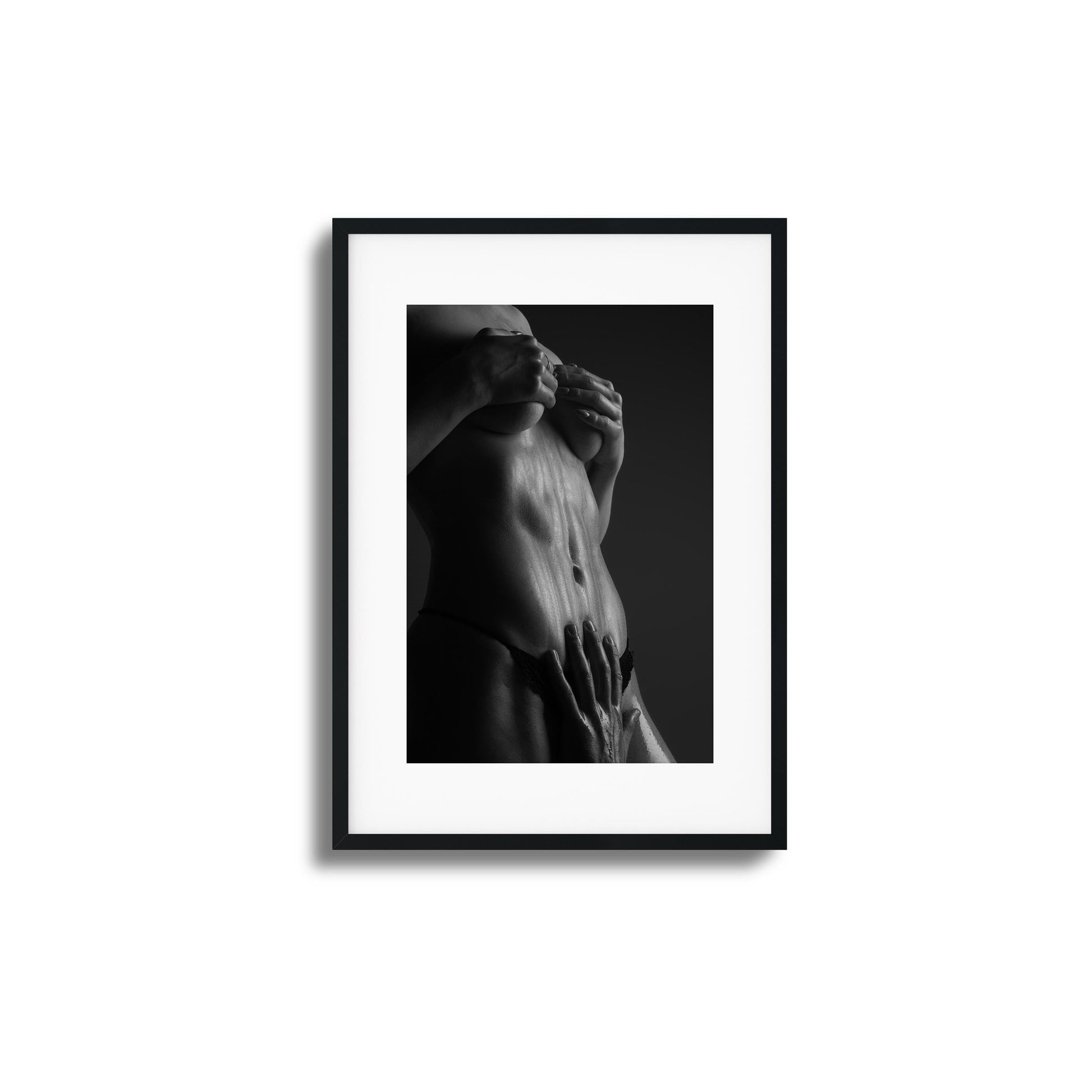 A striking black & white fine art photograph capturing the raw sensuality of the human form. The interplay of light, shadow, and texture evokes power, passion, and intimacy. This framed artwork makes a bold statement, celebrating beauty, strength, and the essence of emergence.