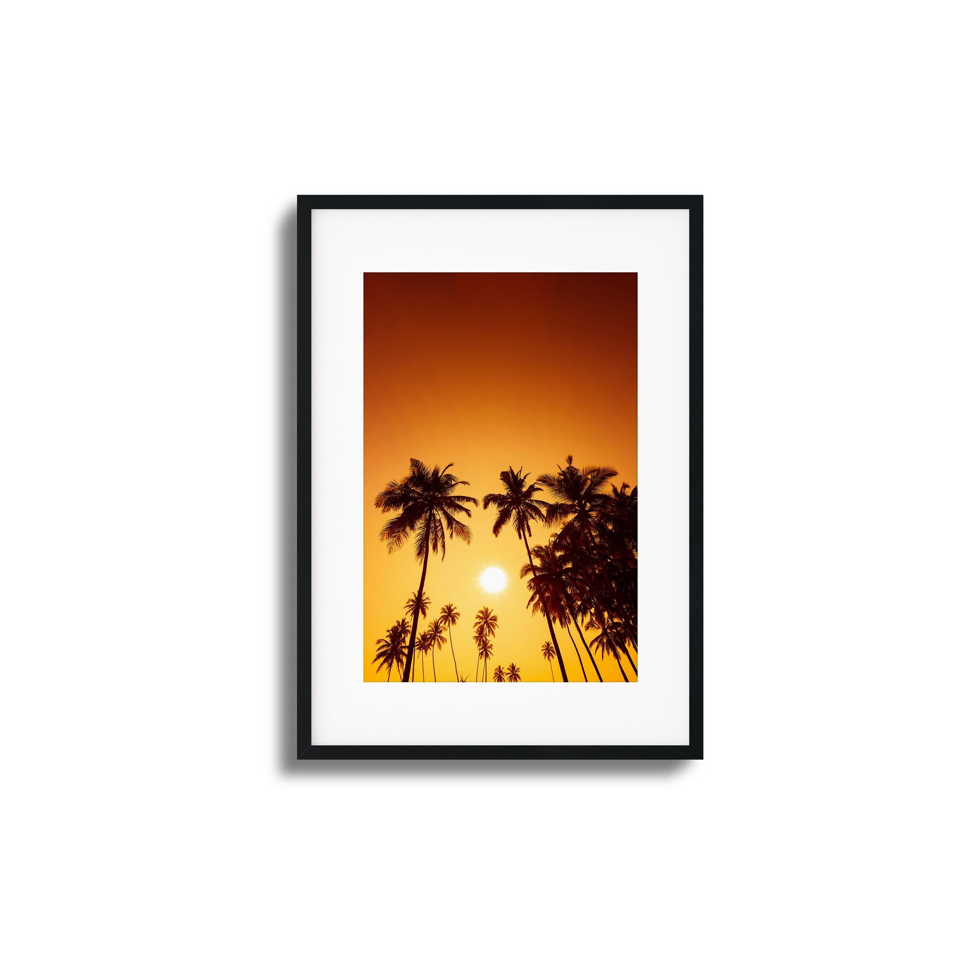 Sunset silhouettes of tall palms in glowing amber light. A relaxing, tropical design for laid-back living spaces.