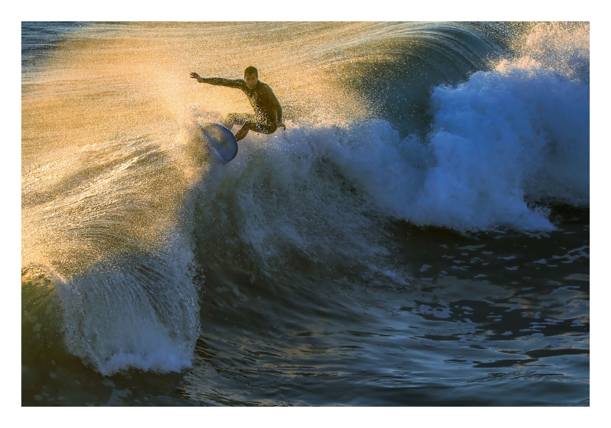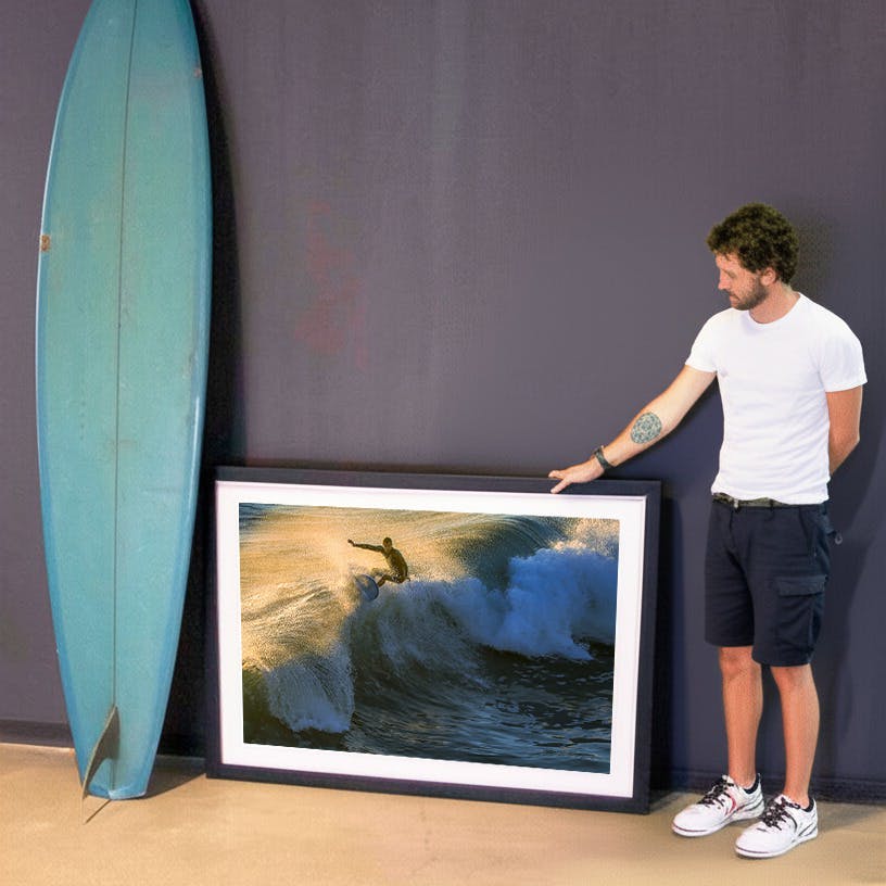 Captured mid-action, a surfer carves the wave in golden light. A powerful shot of freedom, adventure, and ocean strength. Premium Framed Art.