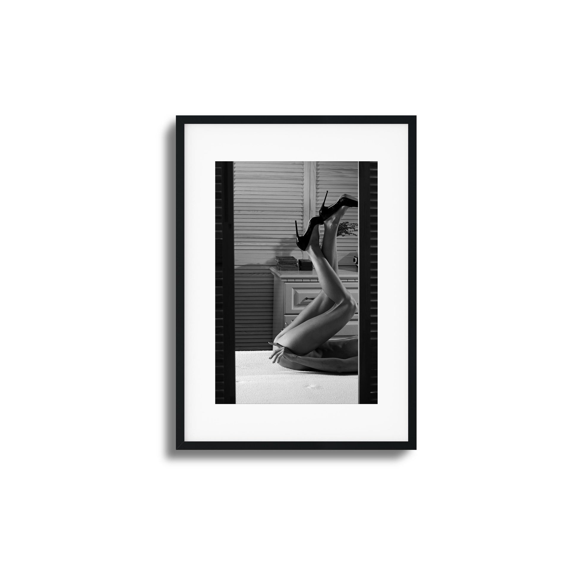 Playful and suggestive black and white nude with stiletto heels in the air. Bold, cheeky, and perfect for seductive interiors.
