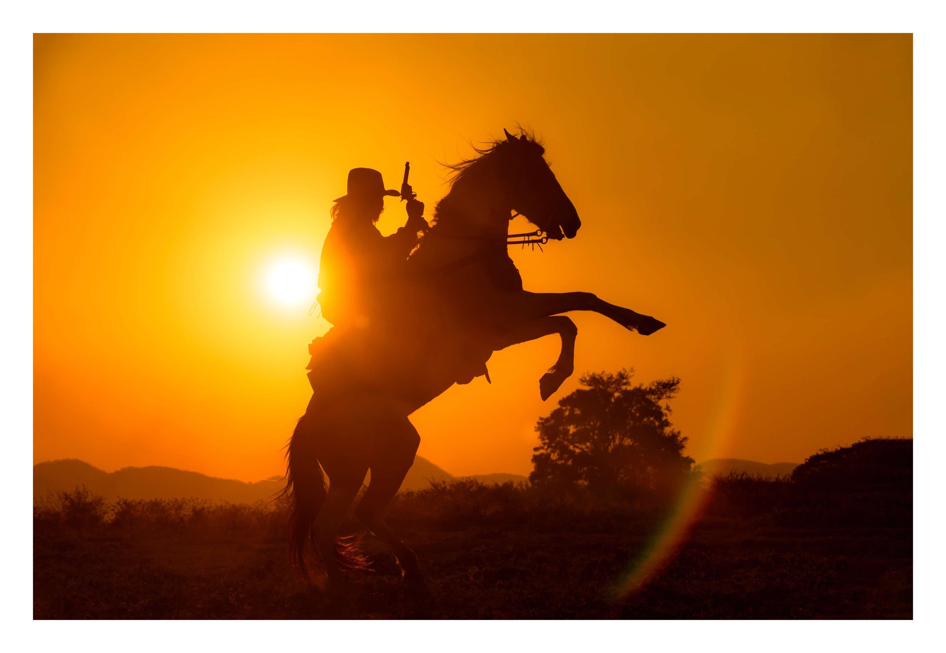 Cowboy with a pistol on a rearing horse. A blazing orange sky meets western legend in this powerful photo.