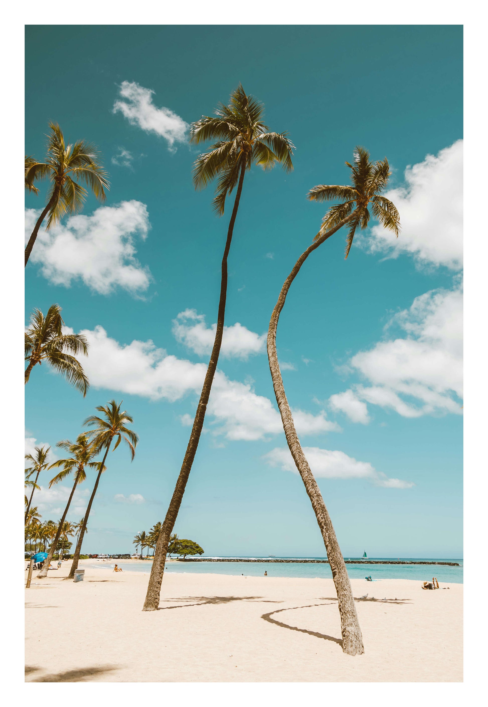 Tropical beach scene with towering palms under a dreamy sky. Perfect escape in a print—relaxed and sun-soaked.