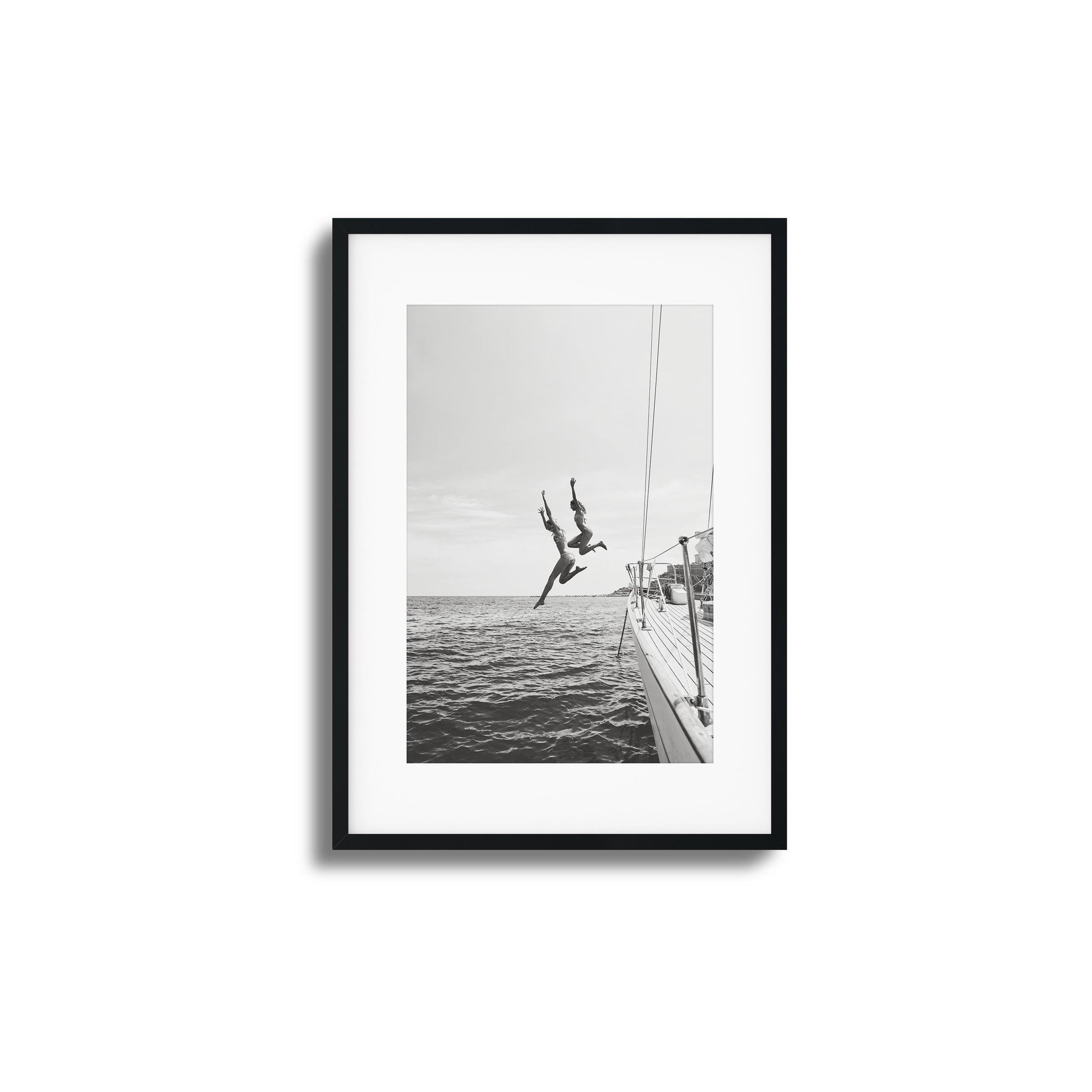 Leap framed art captures the exhilarating moment of two figures jumping from a yacht into the sea. A beautiful representation of freedom and adventure.
