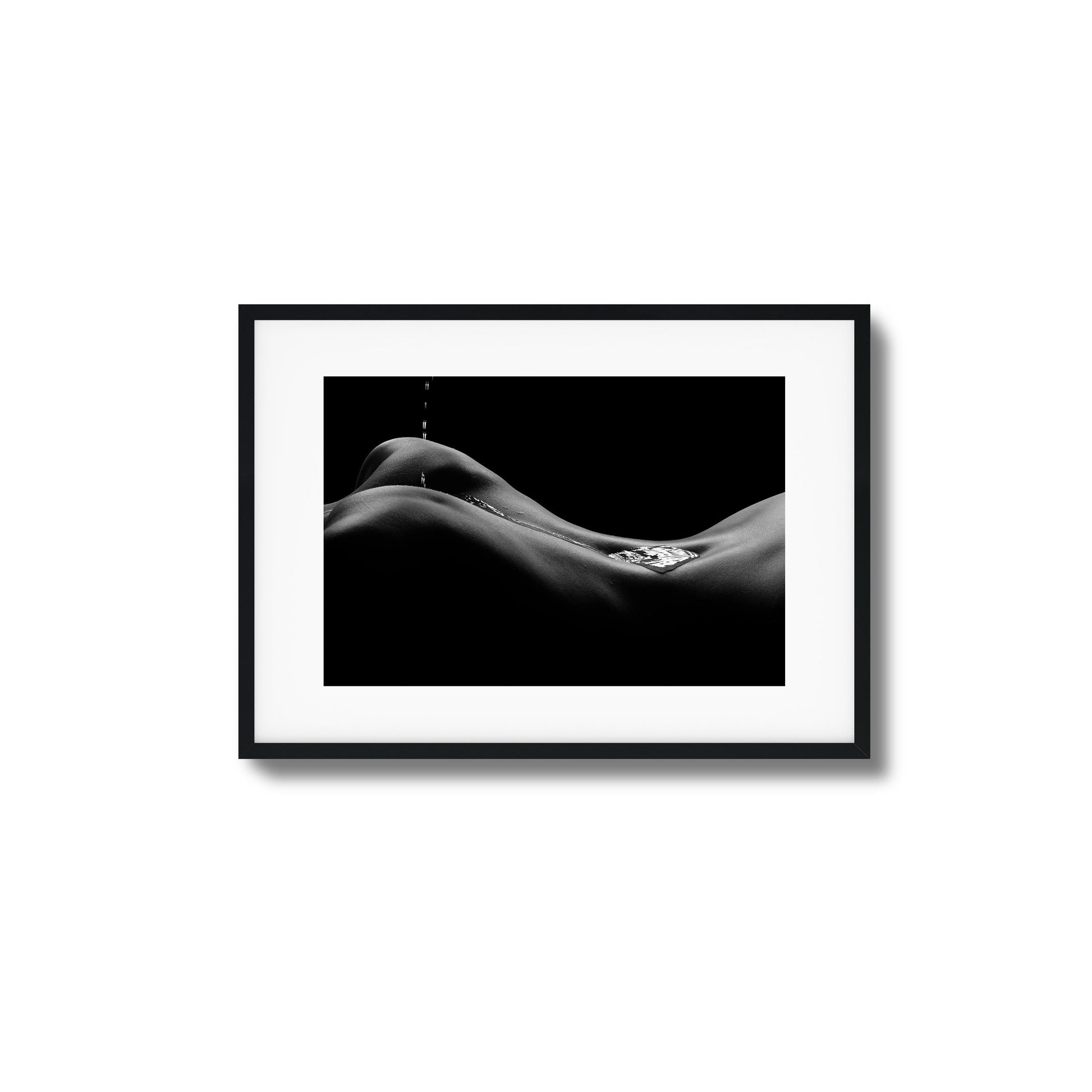 Water caresses a nude form like fire—this black and white framed art radiates heat and grace.