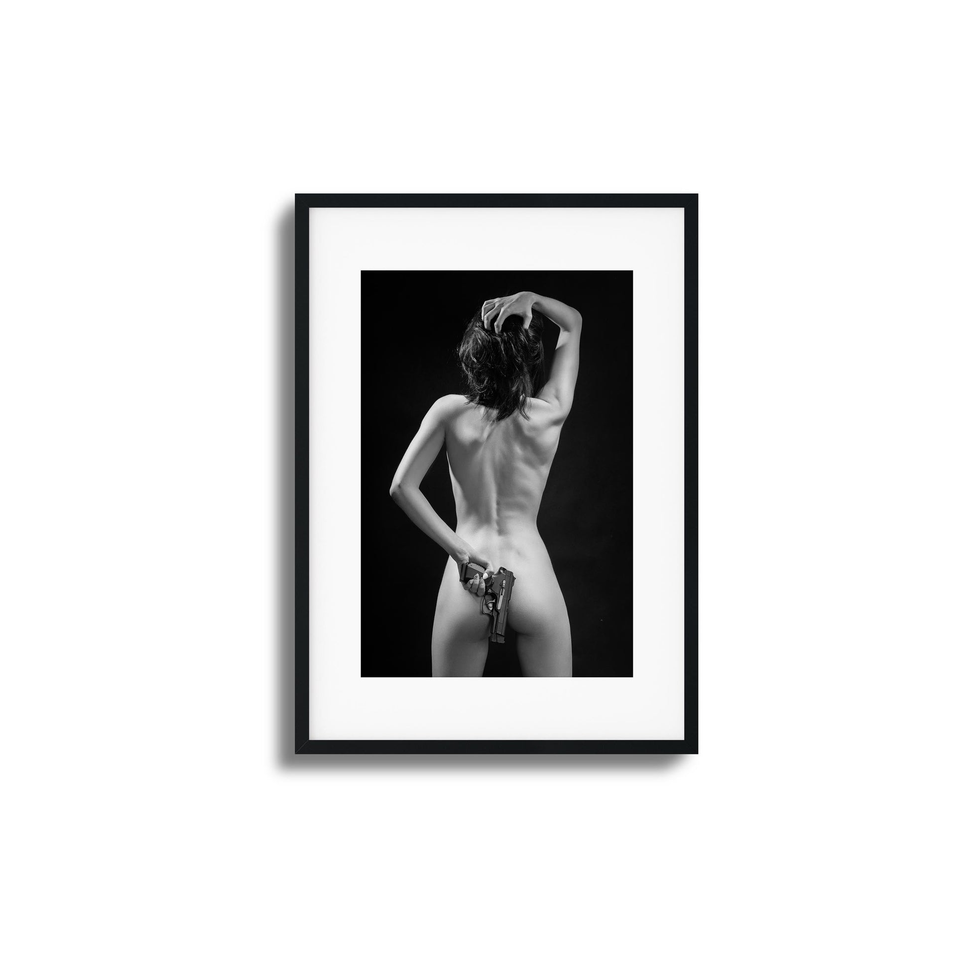 Bold black and white of a nude woman holding a weapon behind her back. Power and provocation blend into one unforgettable visual.