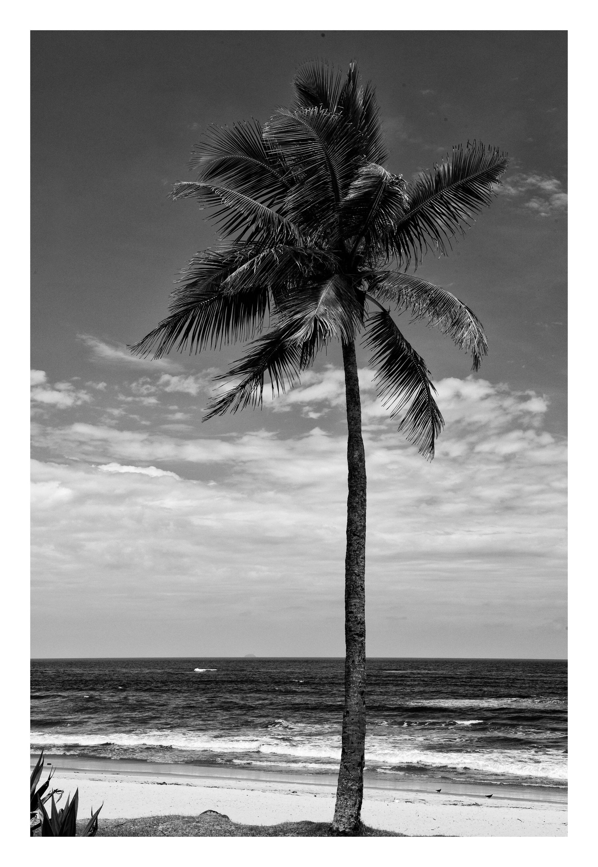 Striking black and white image of a lone palm on a quiet beach. Perfect minimalist tropical wall art.