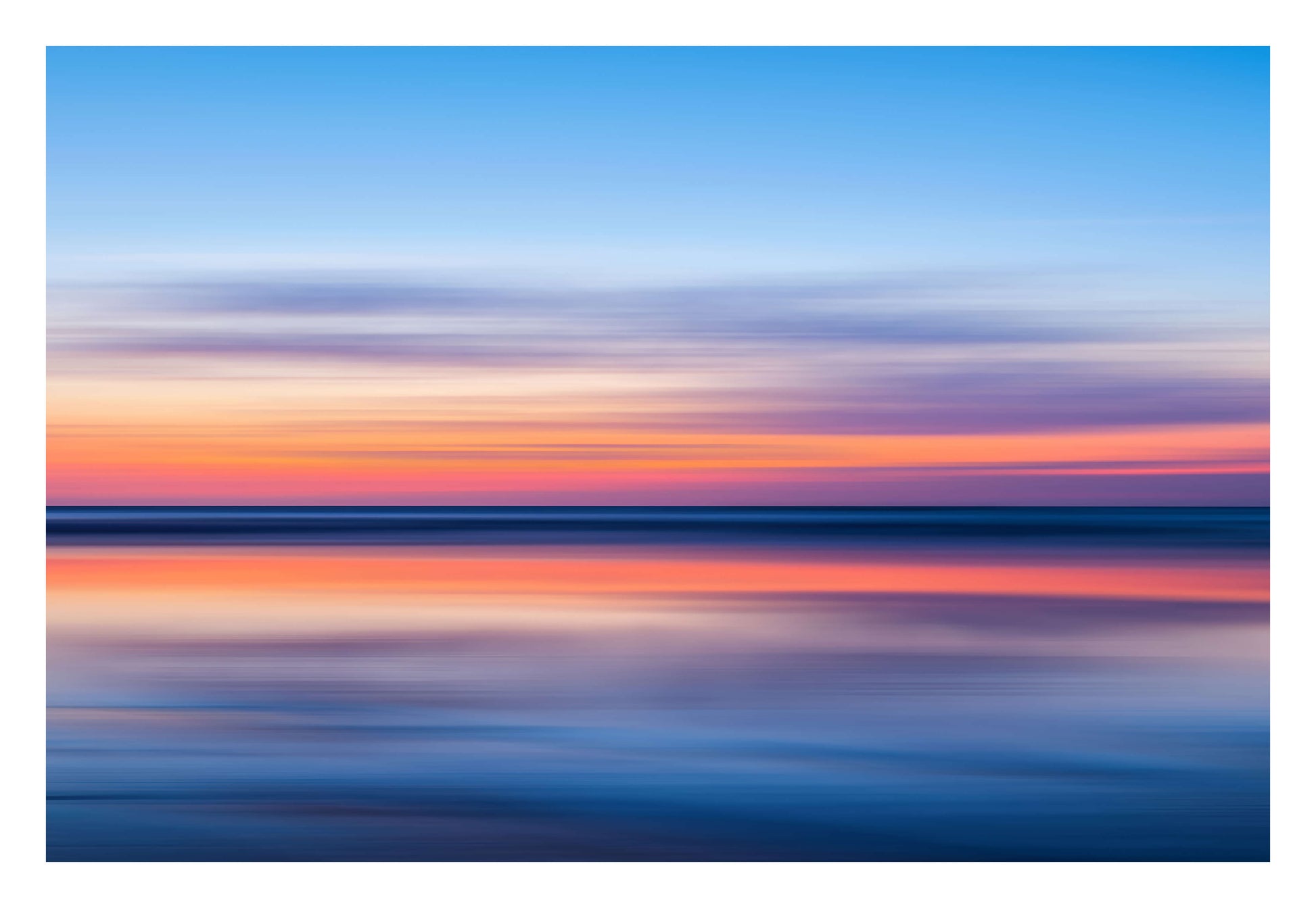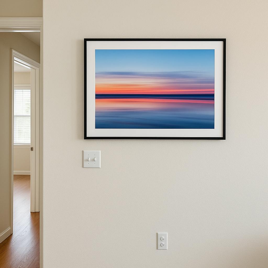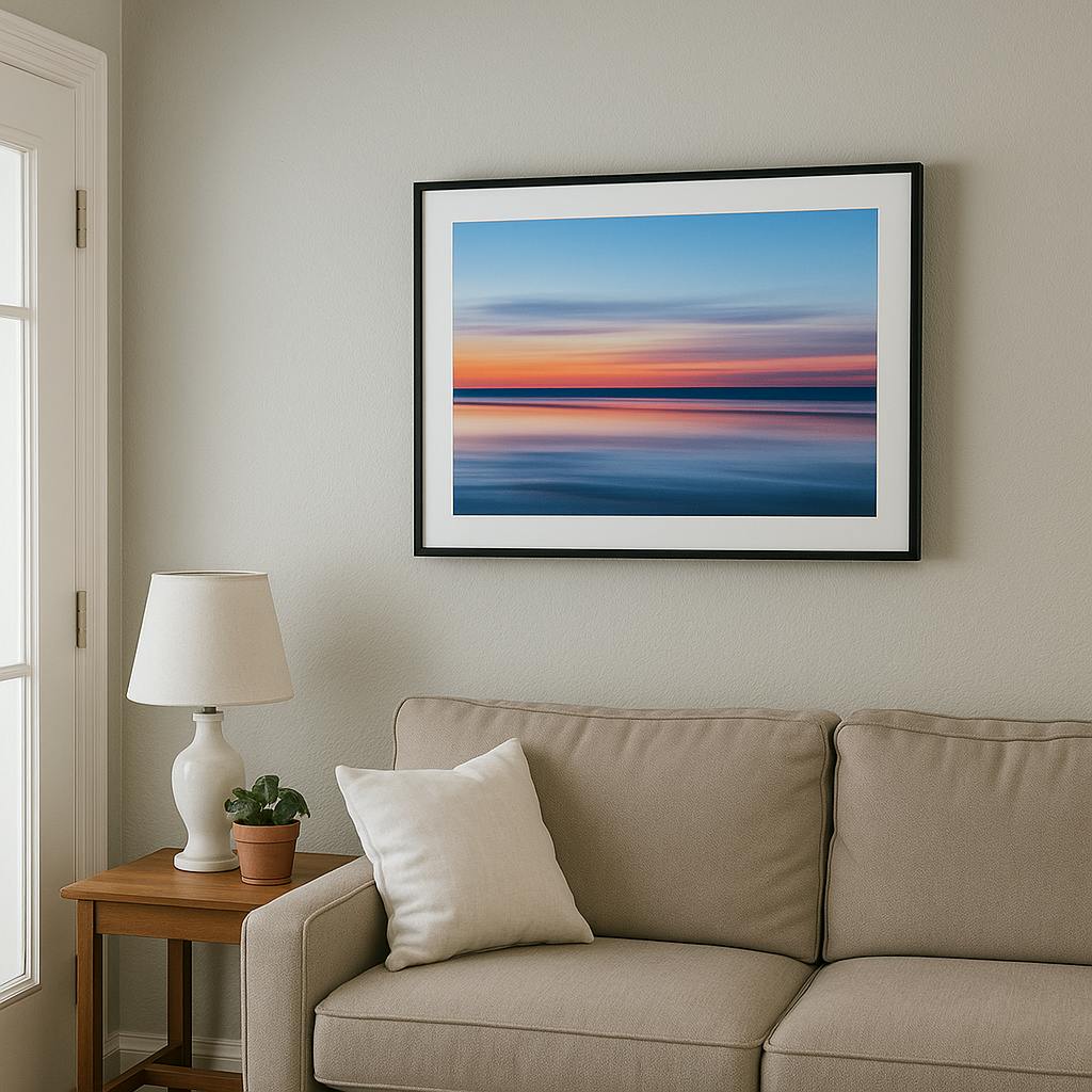 A dreamy abstract seascape, blending vibrant hues of sunset and ocean in a serene framed art print.
