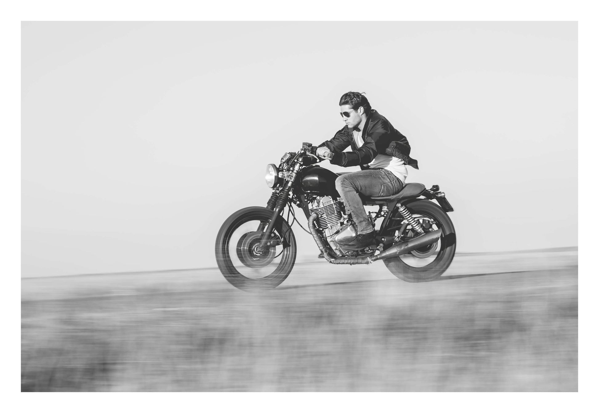 A sleek black-and-white framed print of a motorcyclist racing forward, symbolizing speed, focus, and determination—perfect for modern wall decor.