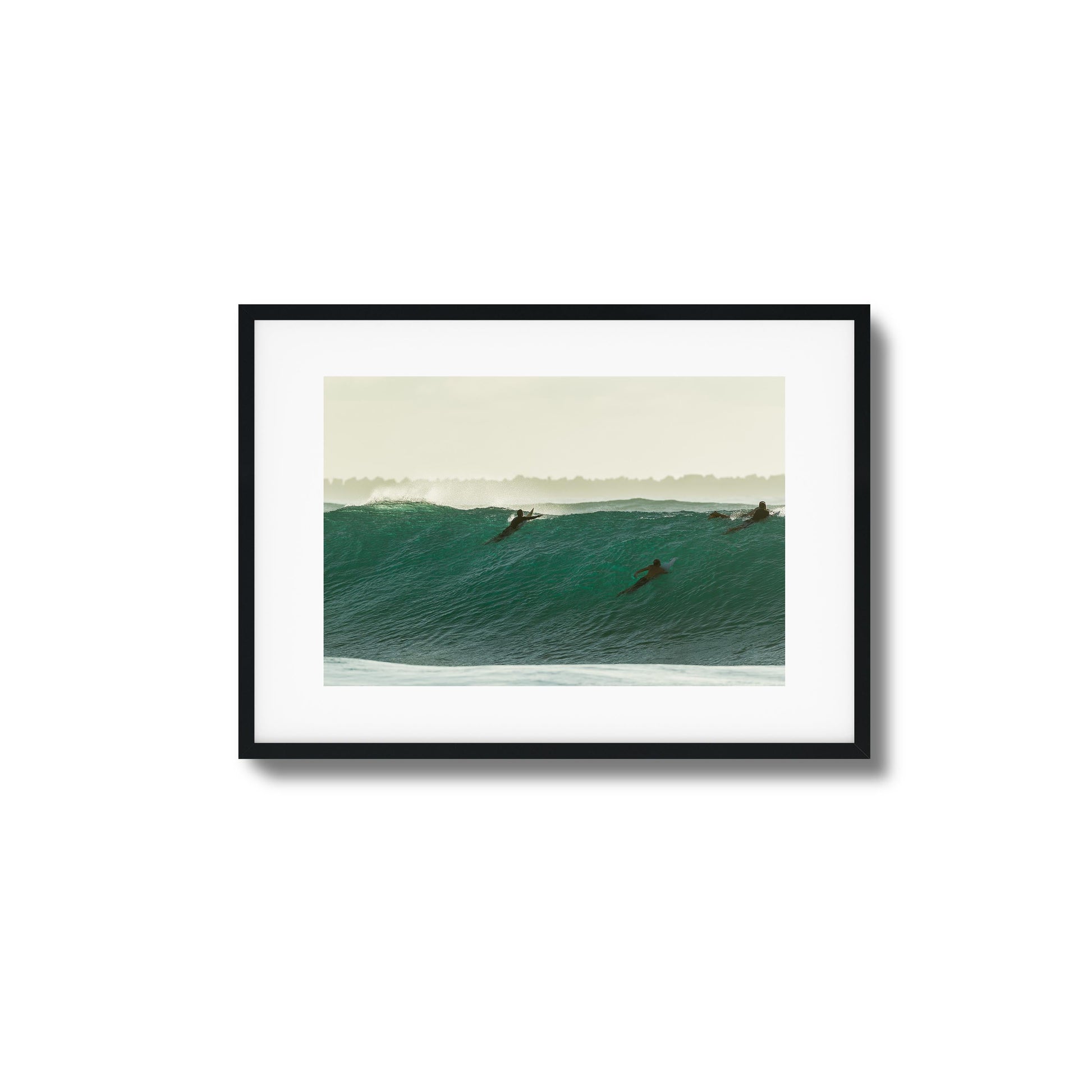 Surfers paddle into towering teal waves in this powerful ocean scene. Iconic framed art and framed photography prints for wall and surf fans.