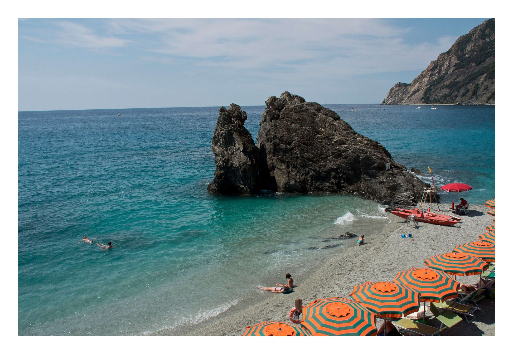Turquoise water laps a quiet rocky cove lined with bold umbrellas, an inviting Mediterranean beach captured in framed print form. Photographed in Italy – pure dolce vita vibes.