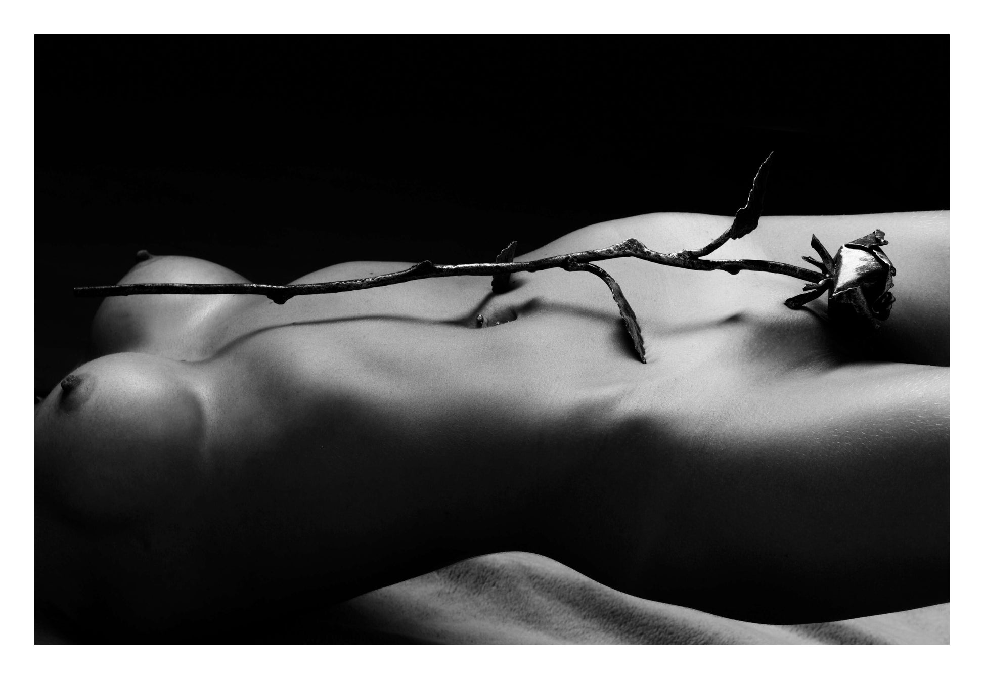 Black and white female nude with a single rose placed on her hip. A bold and elegant blend of softness and strength.