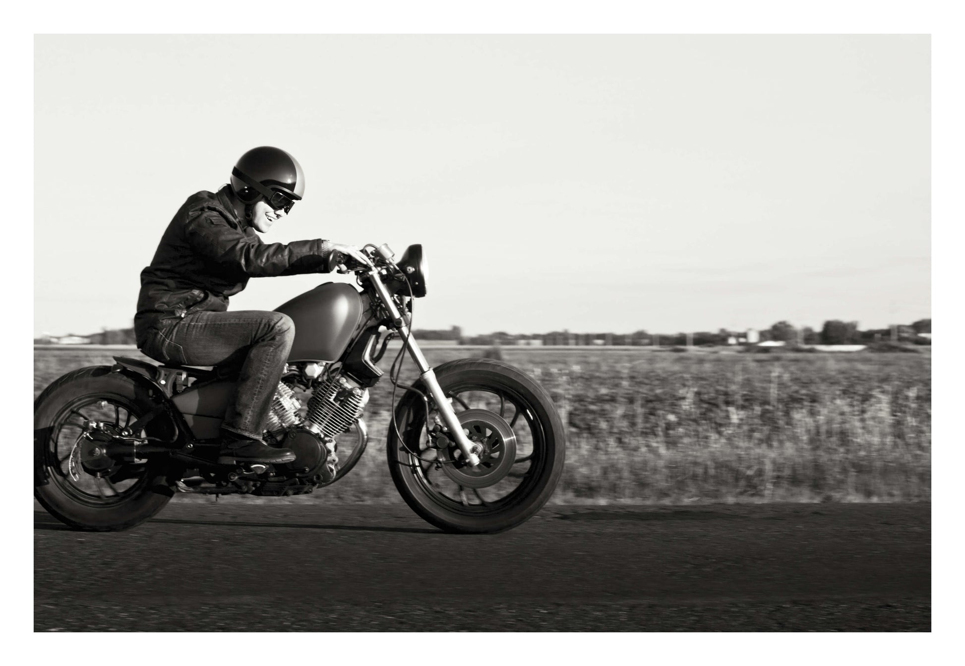 A powerful black-and-white framed print of a motorcyclist accelerating across the road, evoking speed, freedom, and adventure for your wall decor.