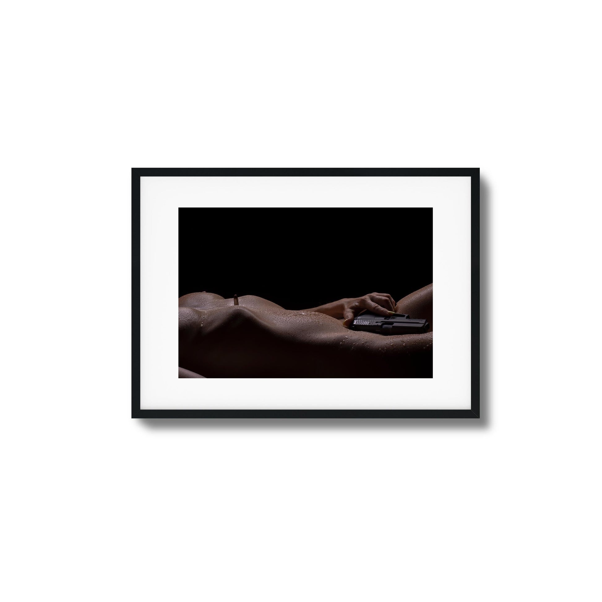 Close-up of a female nude with a sleek sidearm resting in her hand. Dark and intense, this piece blends beauty with tension. Framed art with attitude.