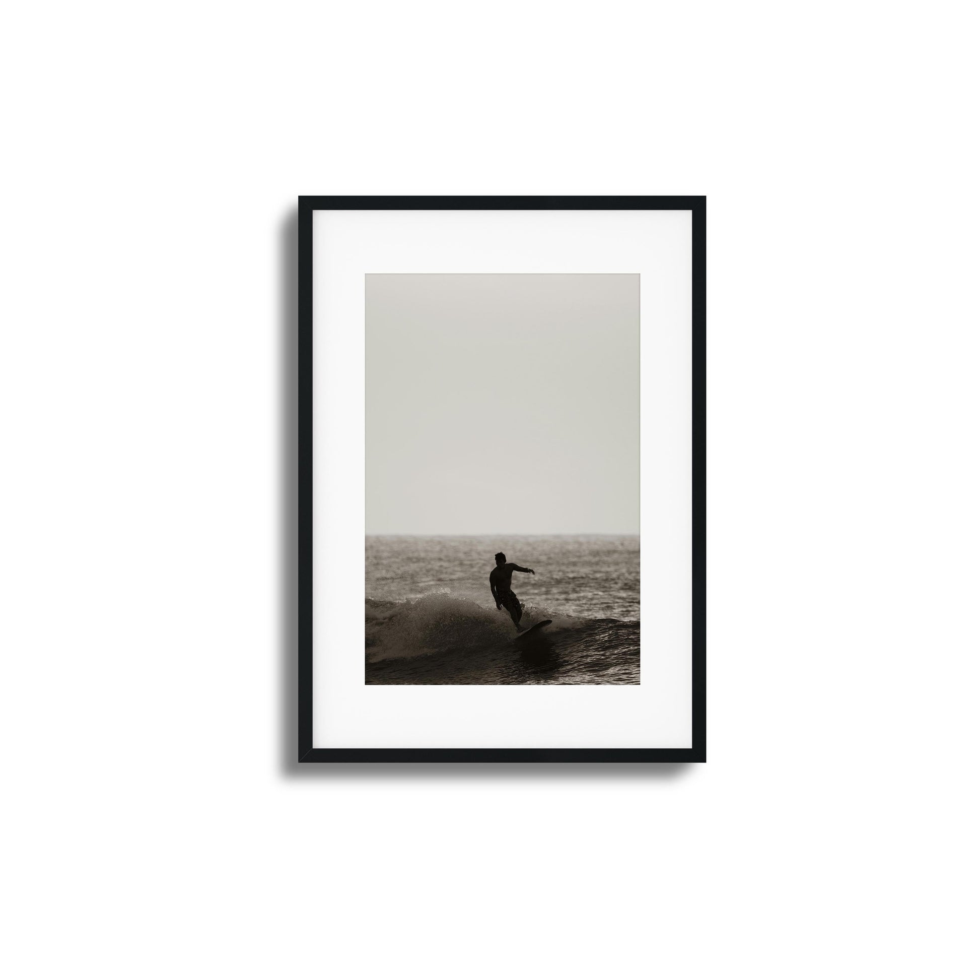 Sepia-toned surfer slicing through a wave. Timeless and moody, with strong male energy and ocean strength.