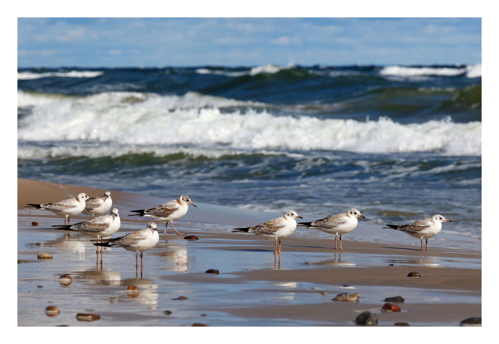 Birds rest on the shoreline in quiet symmetry. A subtle black and white framed art piece for calm and coastal-themed interiors.