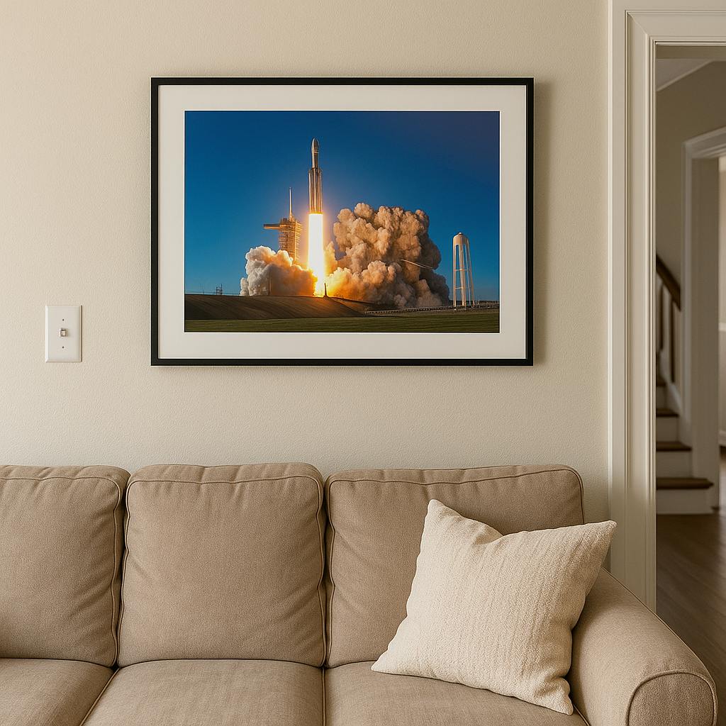 Experience the thrill of space exploration with this stunning framed artwork of a SpaceX rocket launch. Perfect for adding a dynamic and inspiring touch to your wall decor.