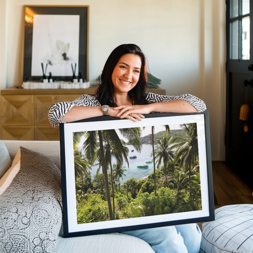 A lush framed print featuring a vibrant tropical view of palm trees, crystal-clear waters, and anchored boats, perfect for creating a tranquil escape at home.