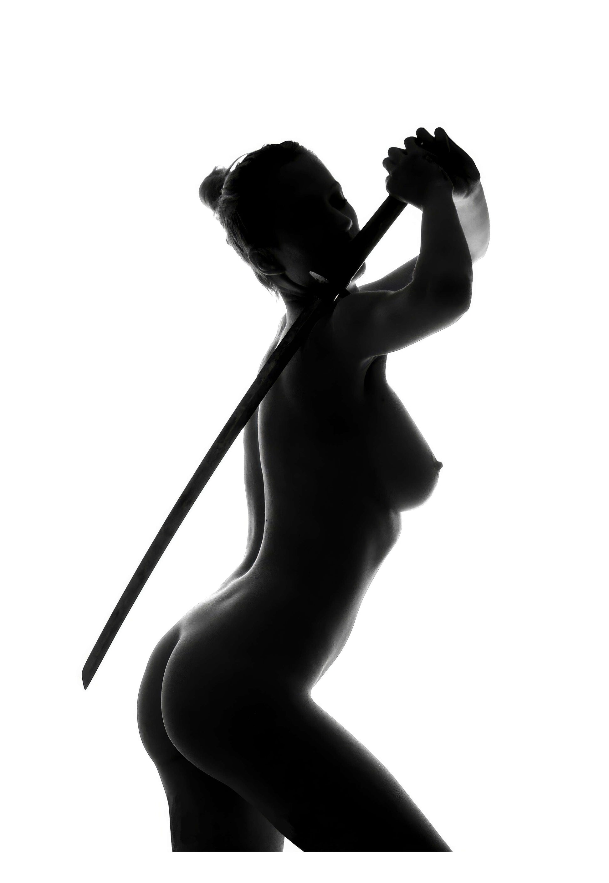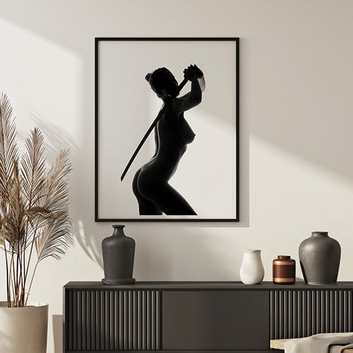 Capture the power and grace of this striking black and white framed artwork, featuring the silhouette of a woman holding a katana. Perfect for adding a touch of strength and elegance to any room.