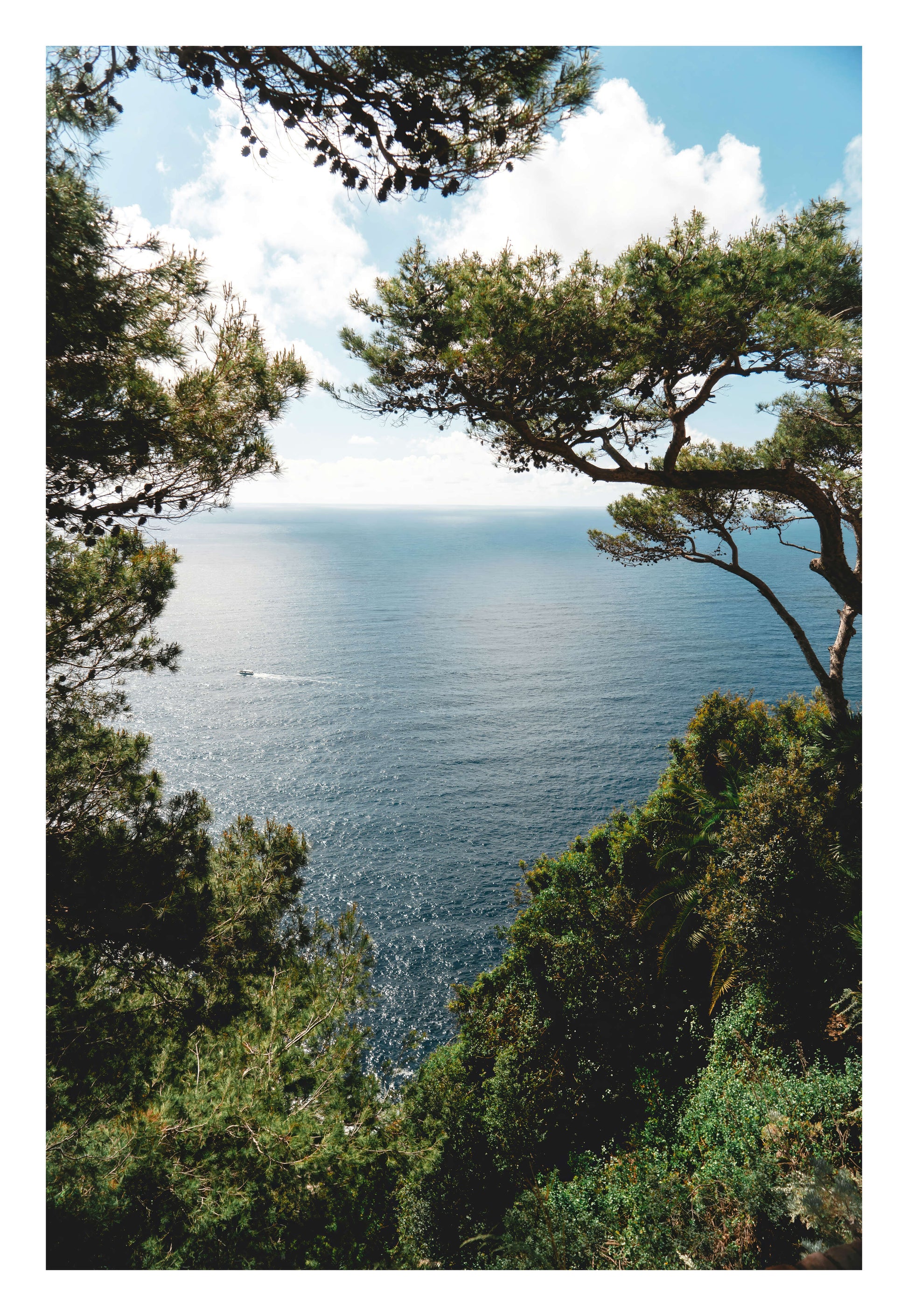 Relax with this serene coastal framed art featuring tree branches framing a calm ocean view under a bright blue sky. Photographed in Italy – pure dolce vita vibes.