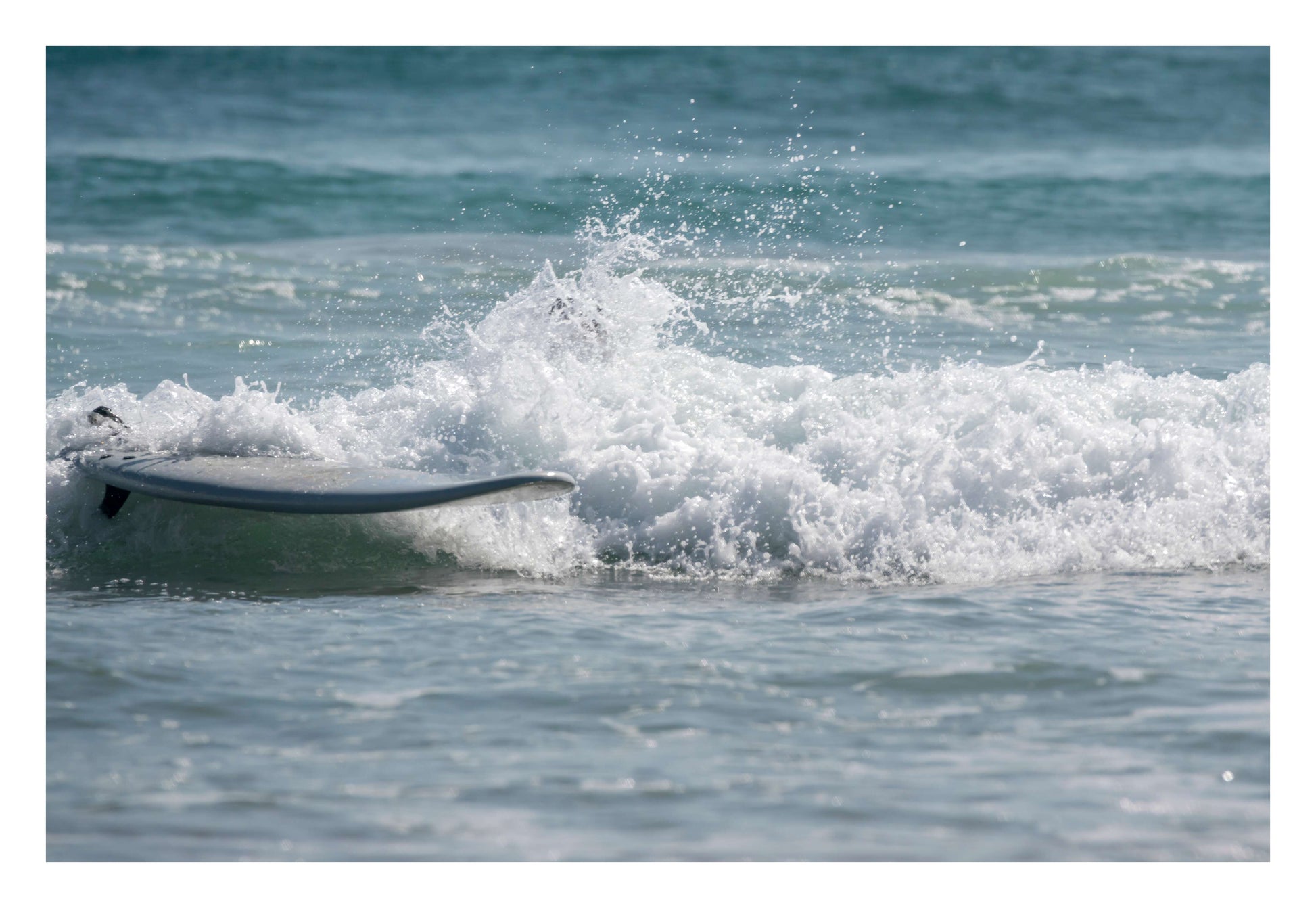A surfboard tossed by waves, capturing the raw power of the ocean in a clean, minimal shot.